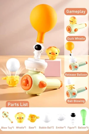 3-in-1 Play: Includes a duck-shaped whistle, floating ball pipes, and an astronaut balloon launcher for varied sensory experiences.